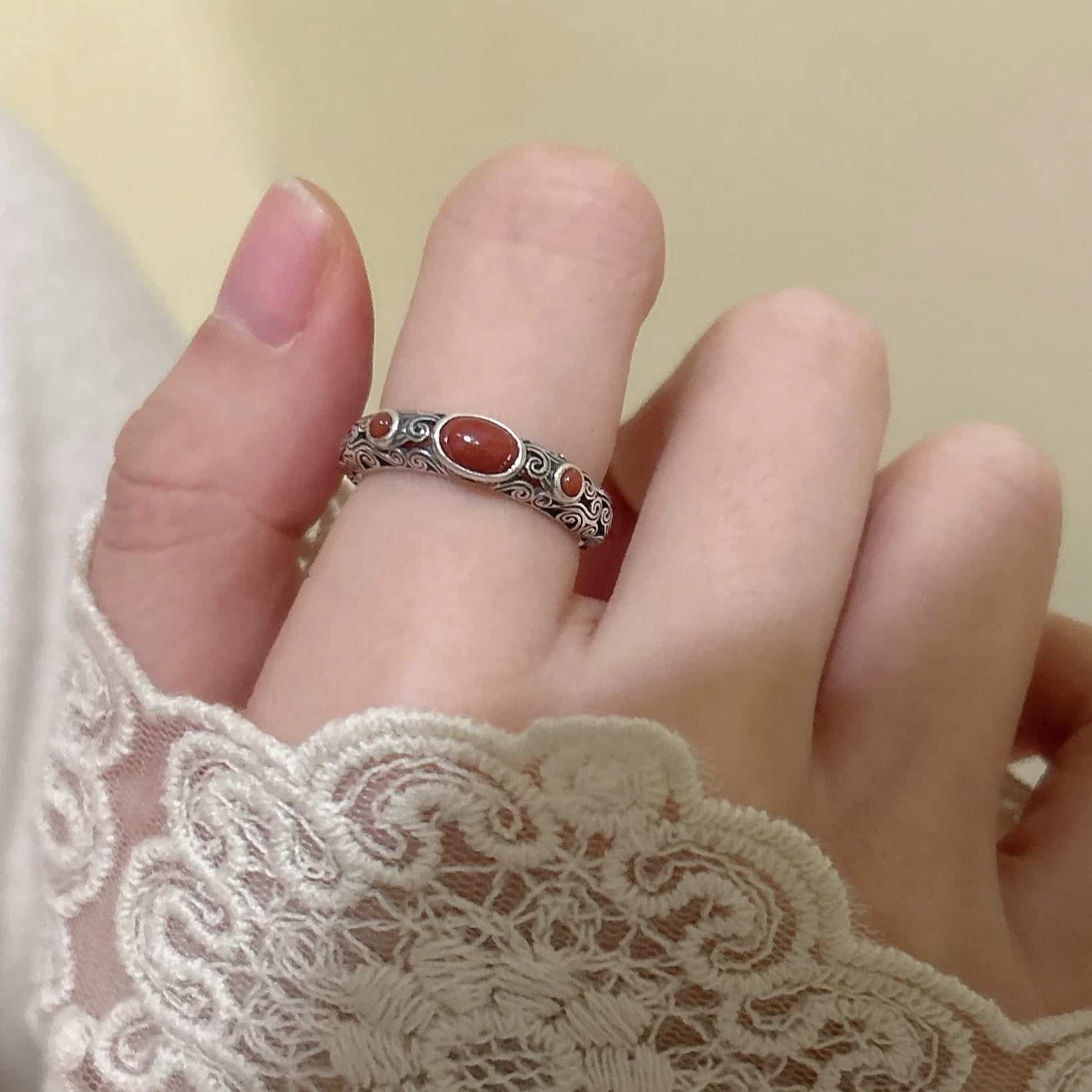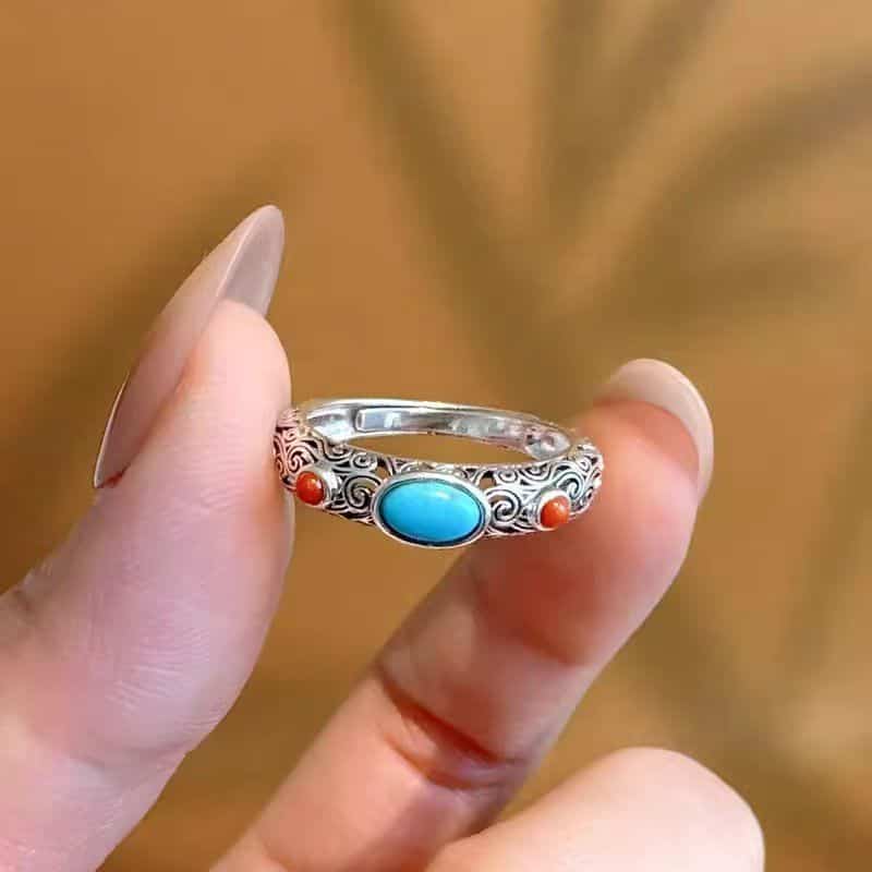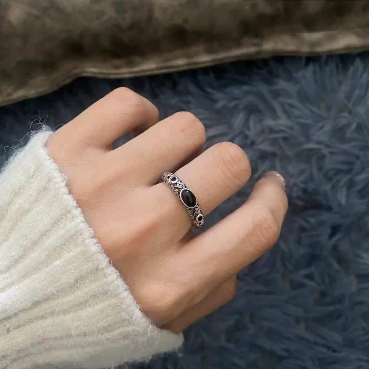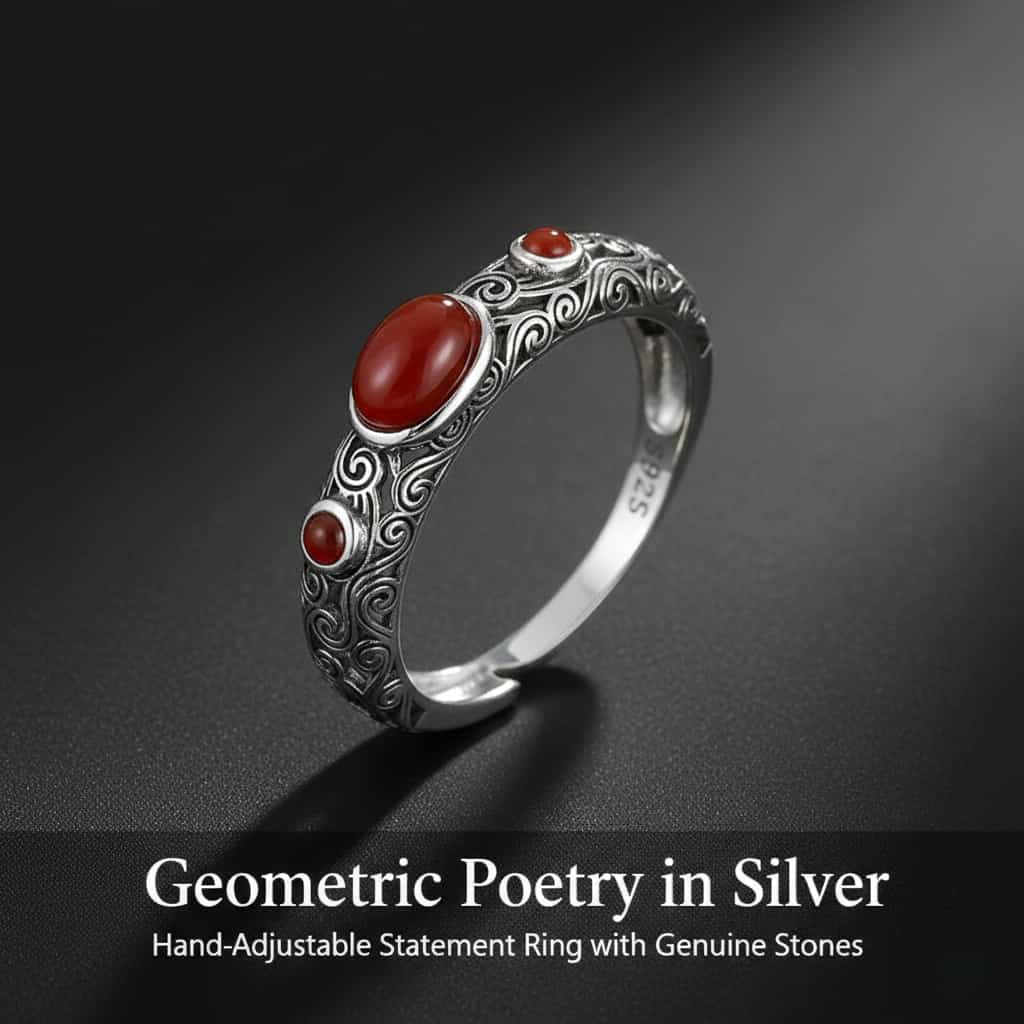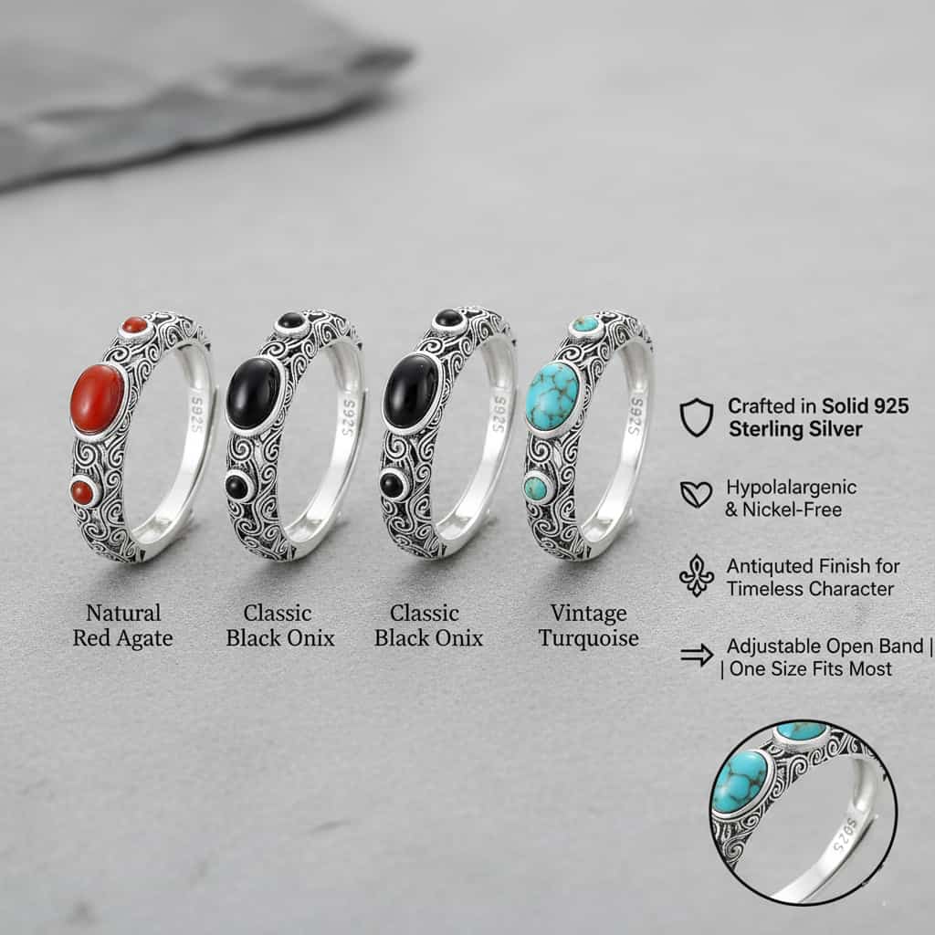 This handcrafted 925 sterling silver adjustable open ring will elevate your jewelry collection. Designed for both men and women, this ring features a hypoallergenic material, a fashionable bohemian design, and is adorned with delicate geometric carvings and a vintage oxidized finish. Each ring is set with a natural gemstone – choose from natural red agate, black onyx, or stabilized turquoise to express your unique style.