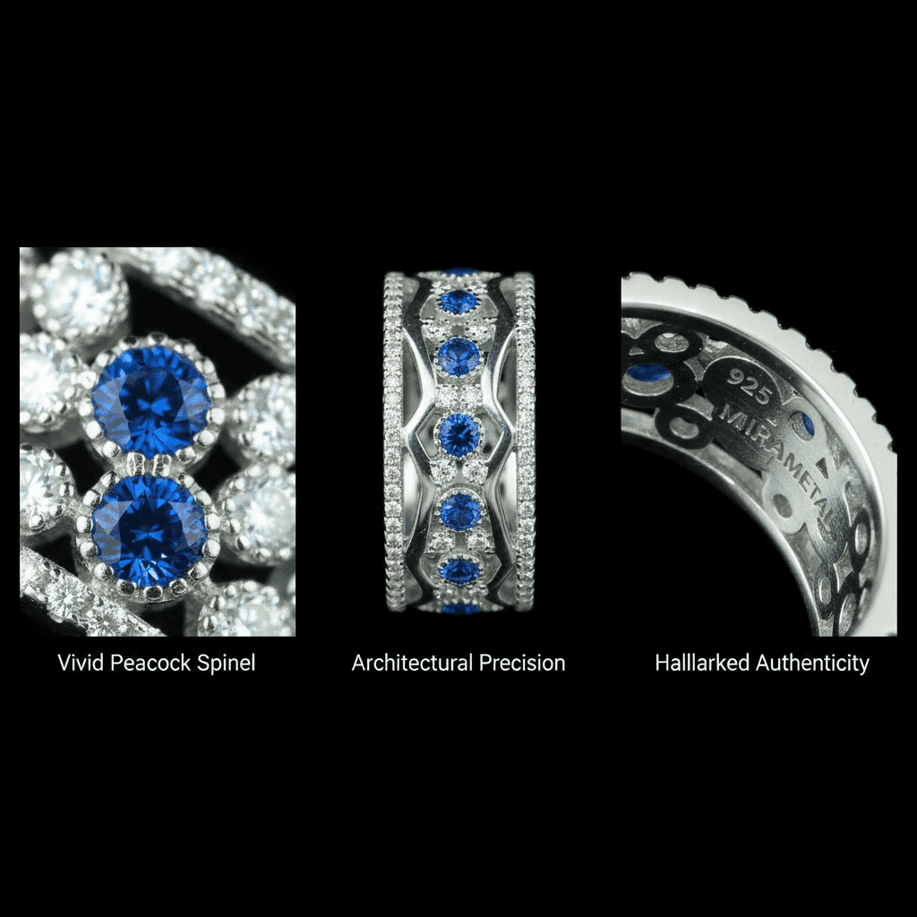 Revive the glamour of the 1920s with a modern ethical twist. The LUMINA Ring features a captivating lab-grown Peacock Blue Spinel set in a bold, architectural 925 sterling silver silhouette. Weighing a substantial 6.3g, this gold-plated statement piece is designed for the woman who commands the room with both strength and sophistication.