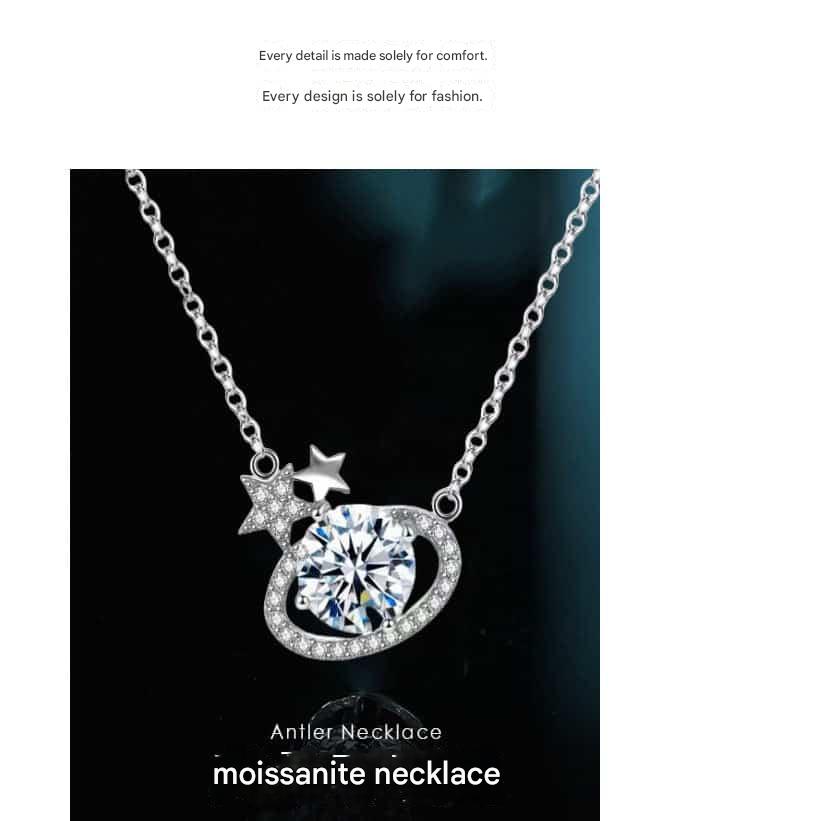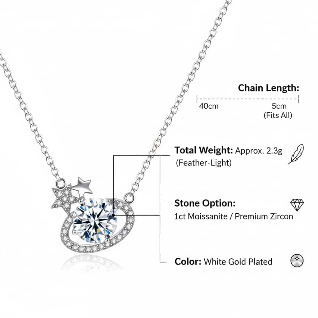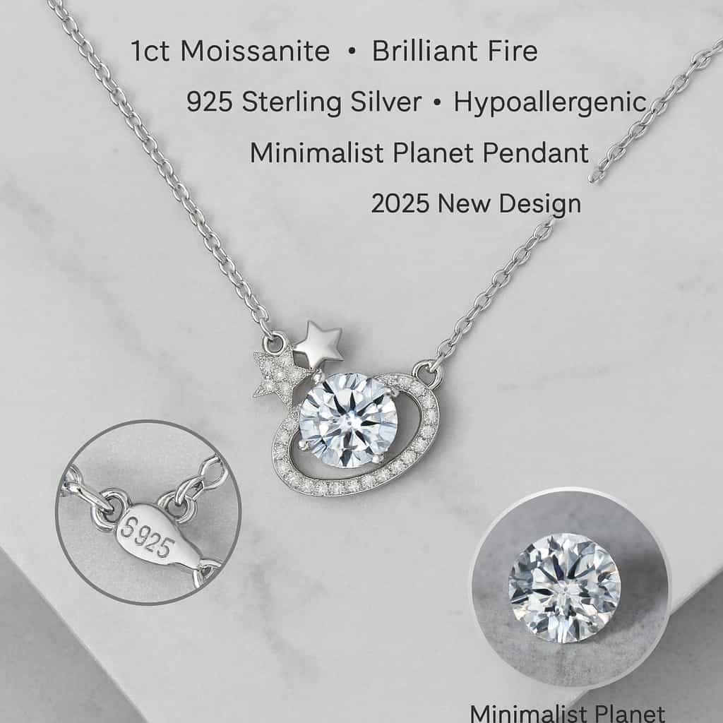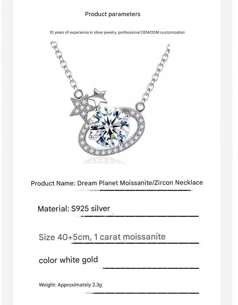 This dreamy planet necklace features a 1-carat moissanite or high-quality zircon, crafted in 925 sterling silver and finished with a delicate white gold plating. Lightweight at only 2.3 grams, the necklace boasts a 40+5 cm adjustable chain and a minimalist starry sky design, allowing you to shine brightly in everyday wear. Made with hypoallergenic materials that resist tarnishing, and incorporating over 10 years of experience in silver jewelry making, this necklace is the perfect gift for loved ones.