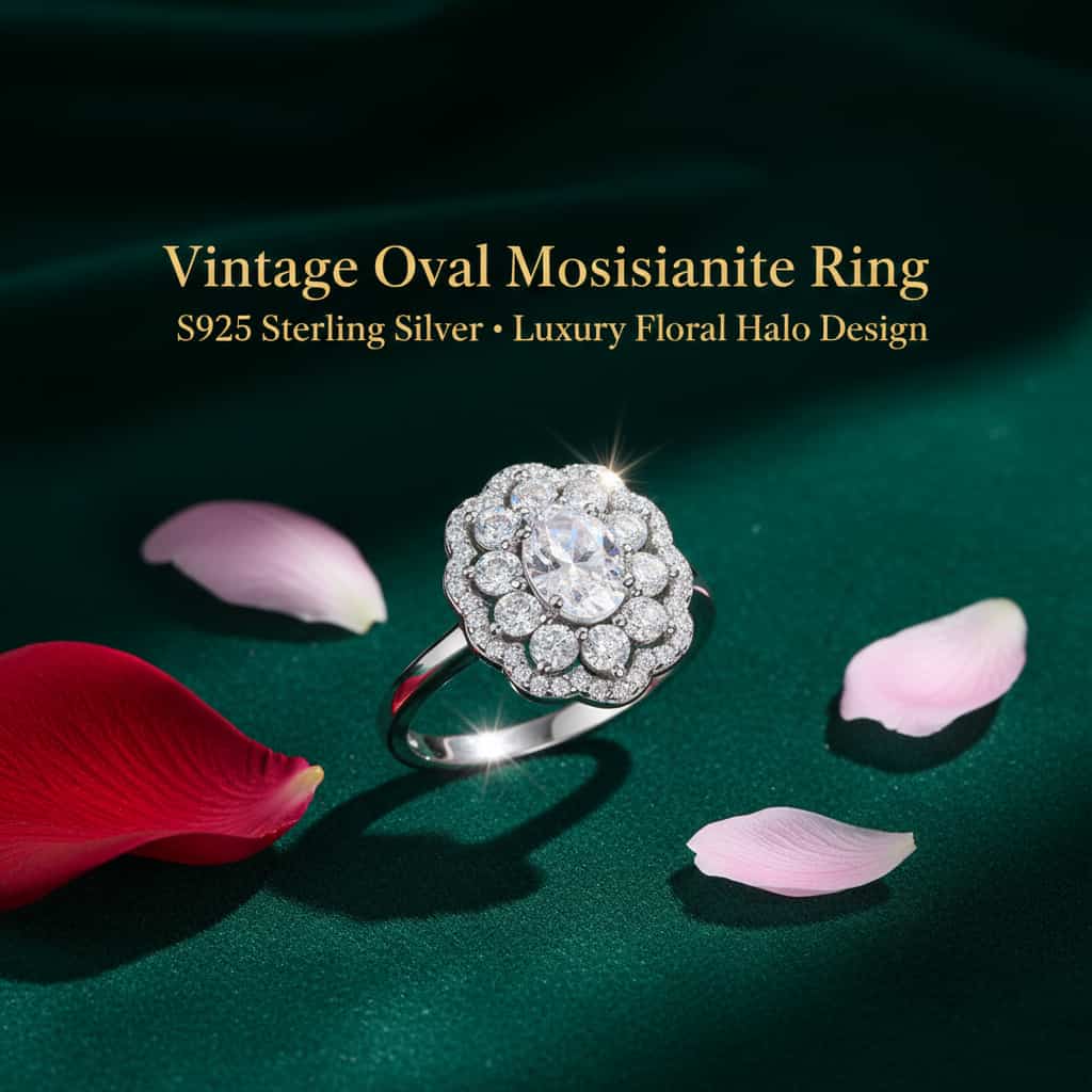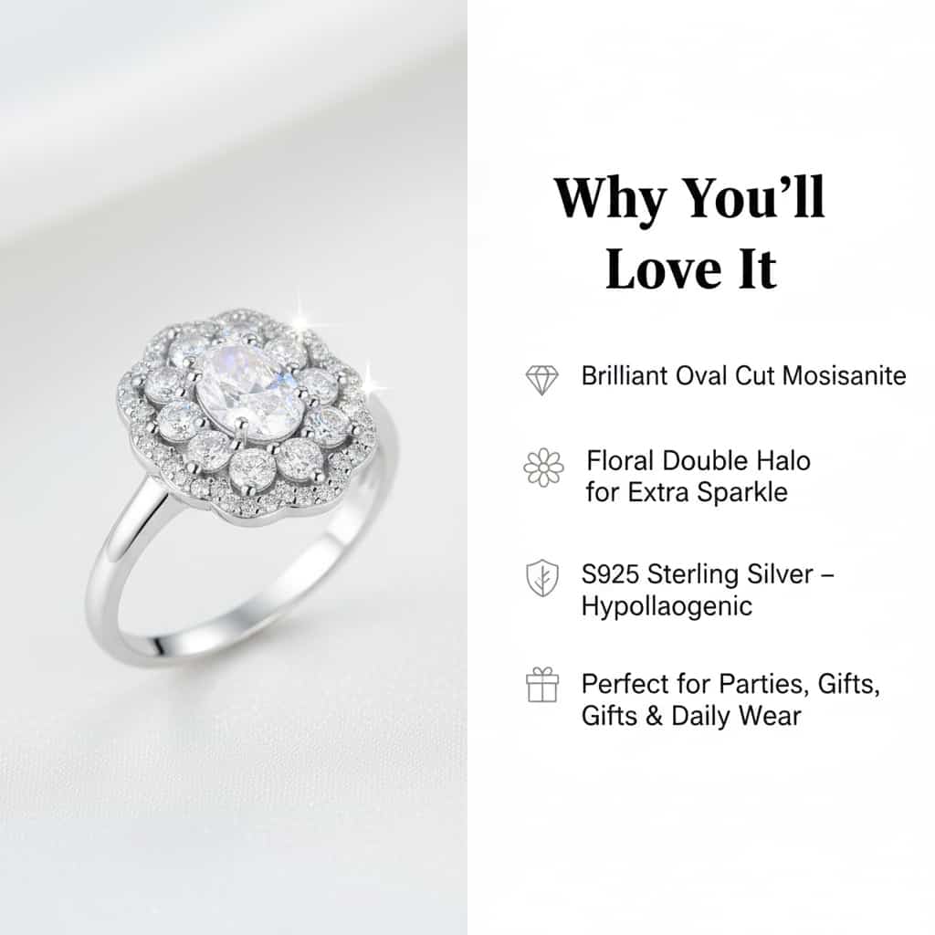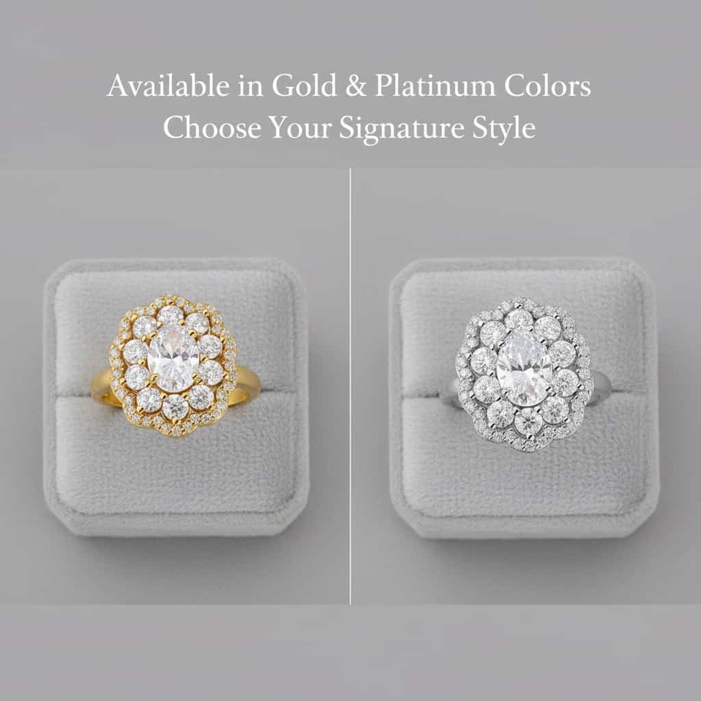 Elevate your look with this vintage-inspired S925 sterling silver moissanite ring, featuring a brilliant 1-carat oval-cut center stone and a double floral halo for maximum sparkle. Available in gold and platinum colors, hypoallergenic, tarnish-resistant, and perfect for parties, daily wear, or gifting. A timeless luxury piece designed for women who love elegance and shine.