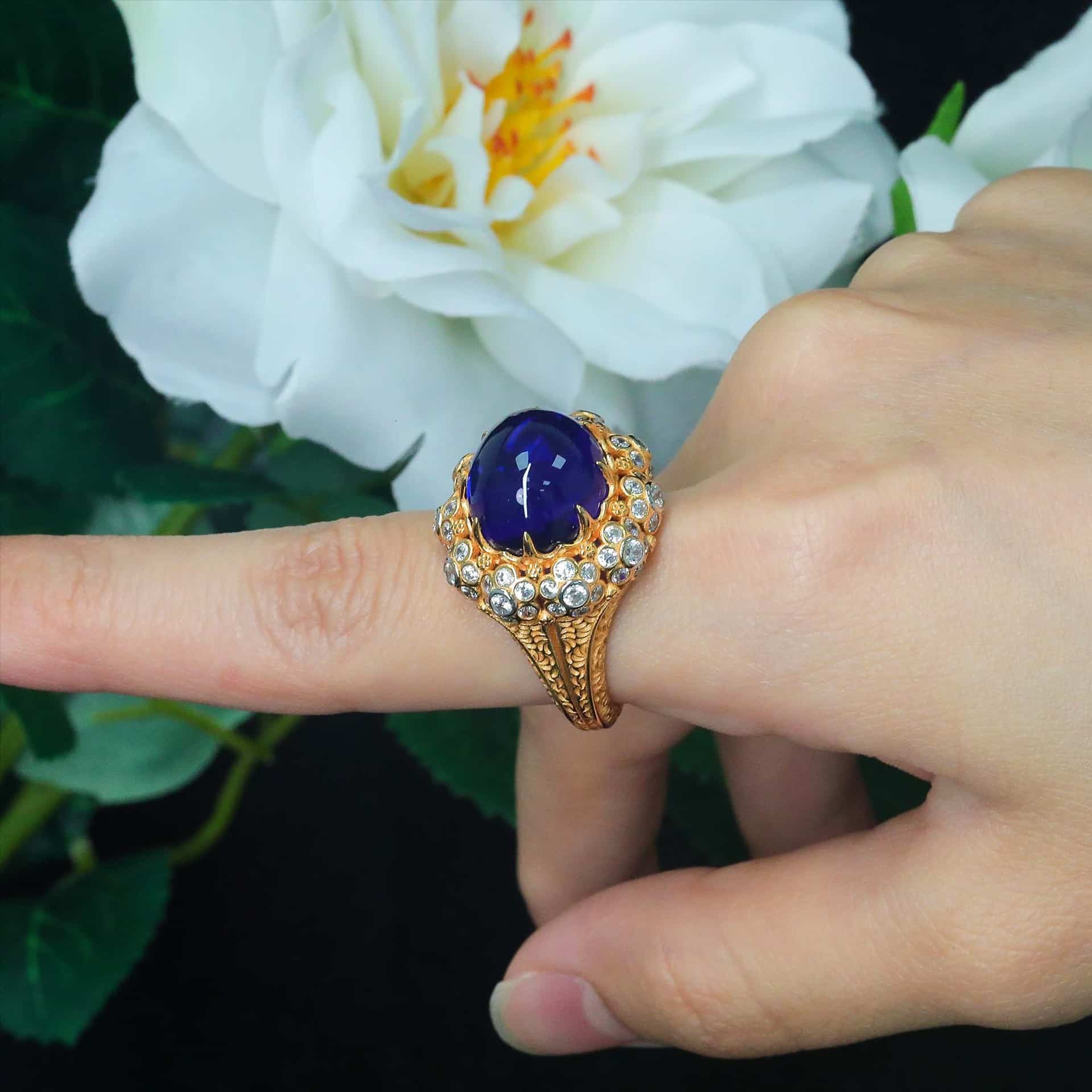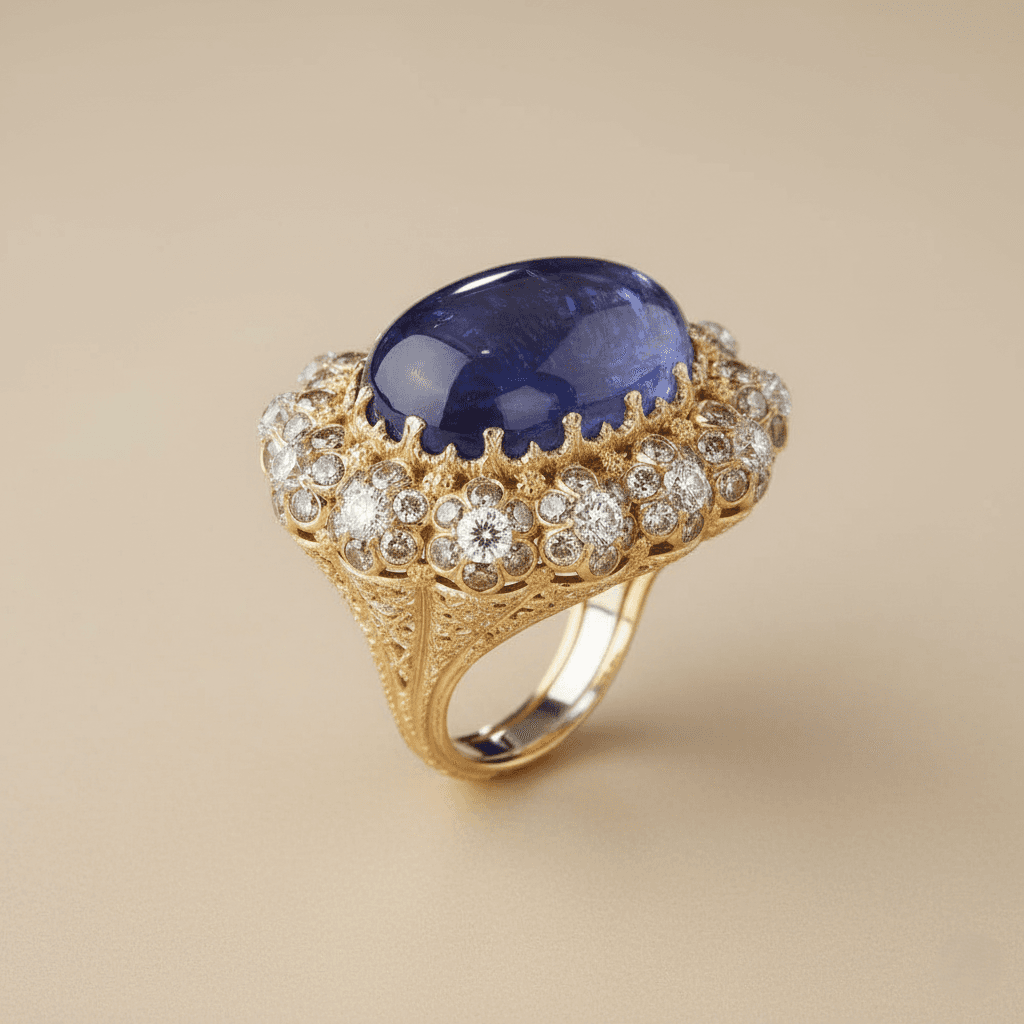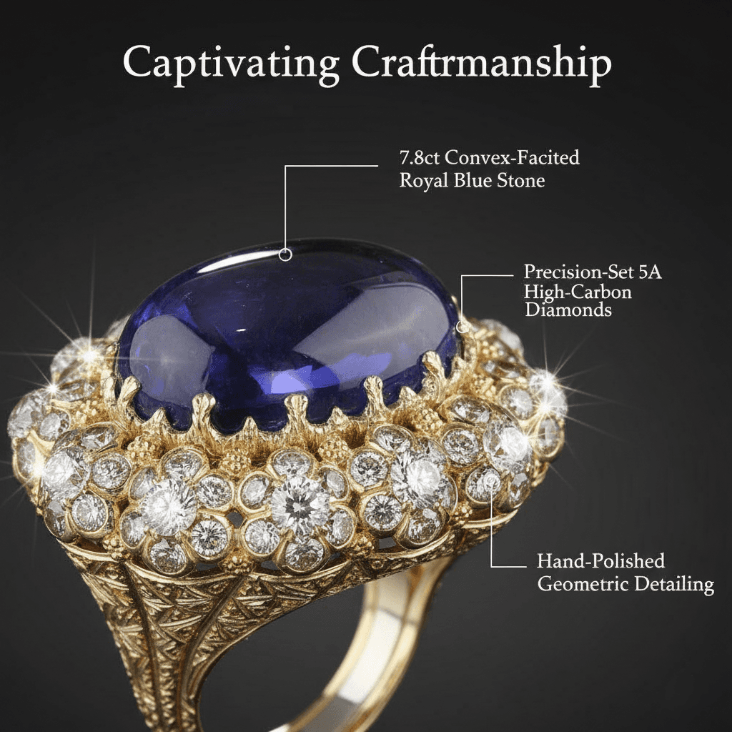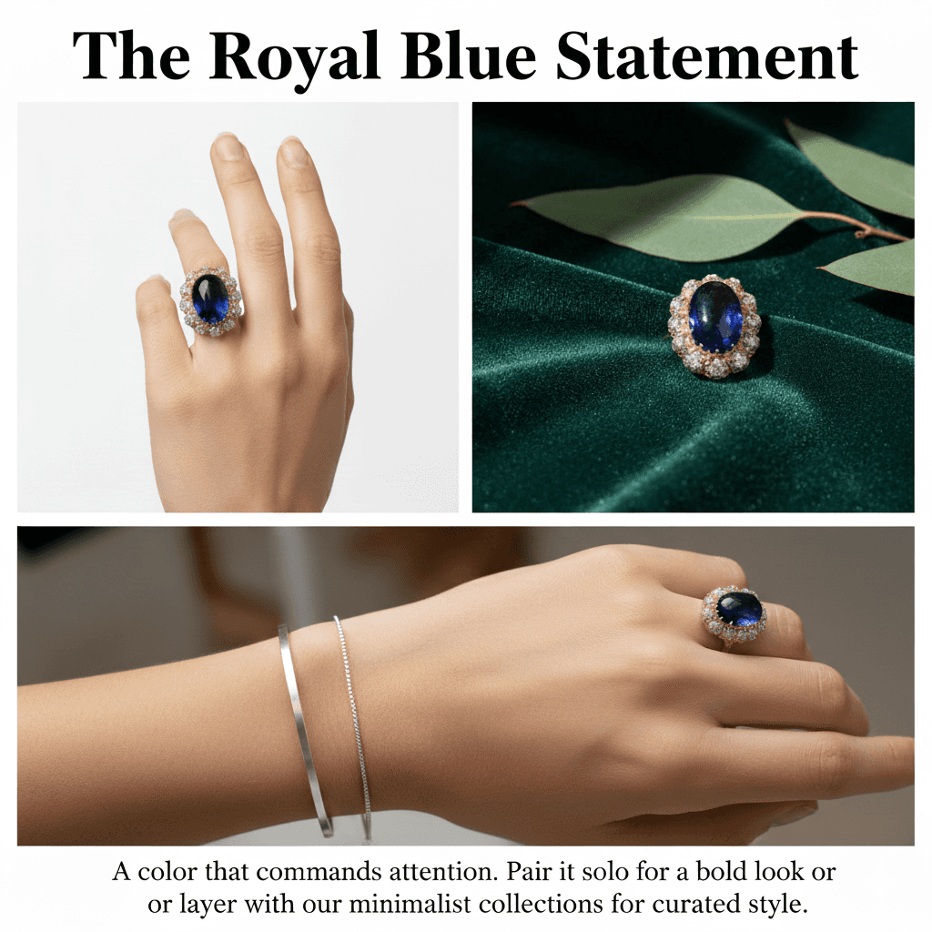 vate your elegance with the mesmerizing depth of Royal Blue. This masterfully crafted 925 Sterling Silver cocktail ring features a breathtaking 7.8ct oval-cut centerpiece, framed by a modern geometric silhouette and shimmering high-carbon diamonds. Finished with a luxurious 18K gold plating, it’s a bold statement of sophistication—perfect for gala evenings or adding a touch of royalty to your everyday style.