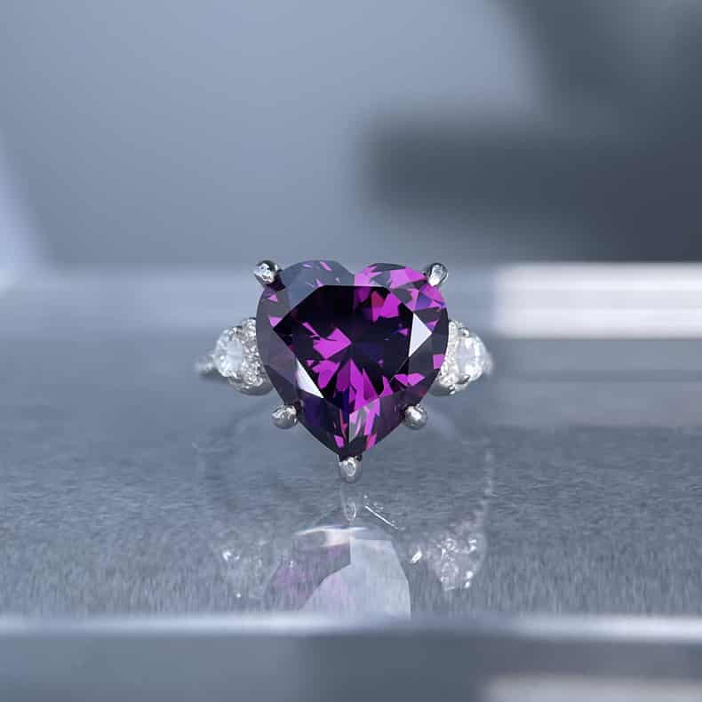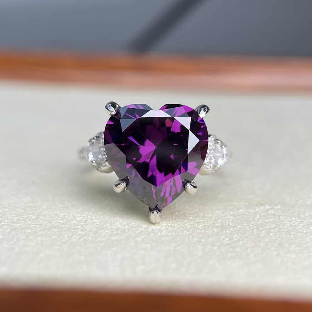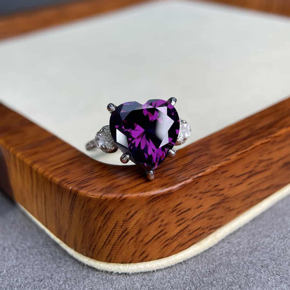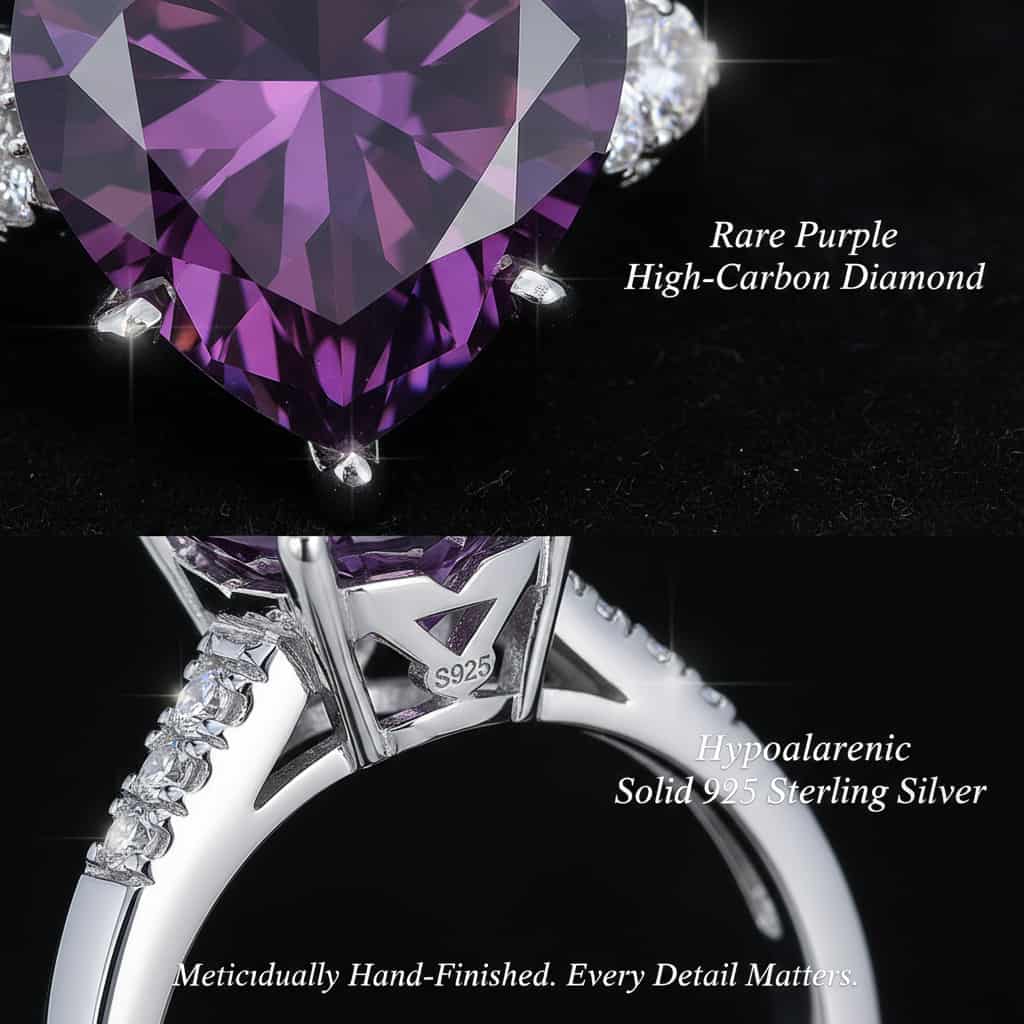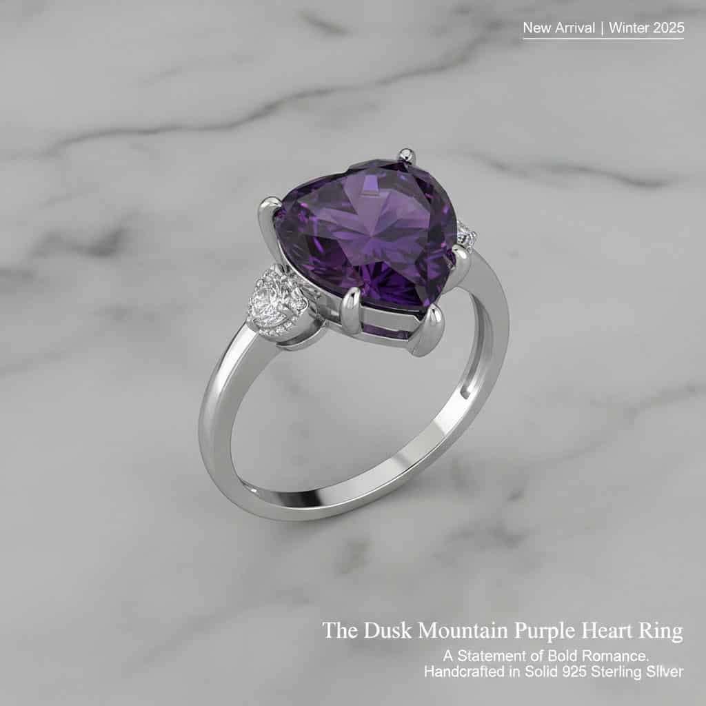 Elevate your style with the MIRAMETAL “Twilight Mountains Purple” heart-shaped ring. This striking ring is crafted from high-quality S925 sterling silver and features a captivating 12×12 mm high-carbon diamond in a rare, deep purple hue.