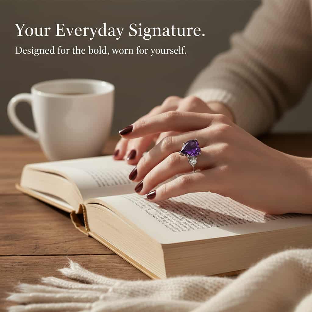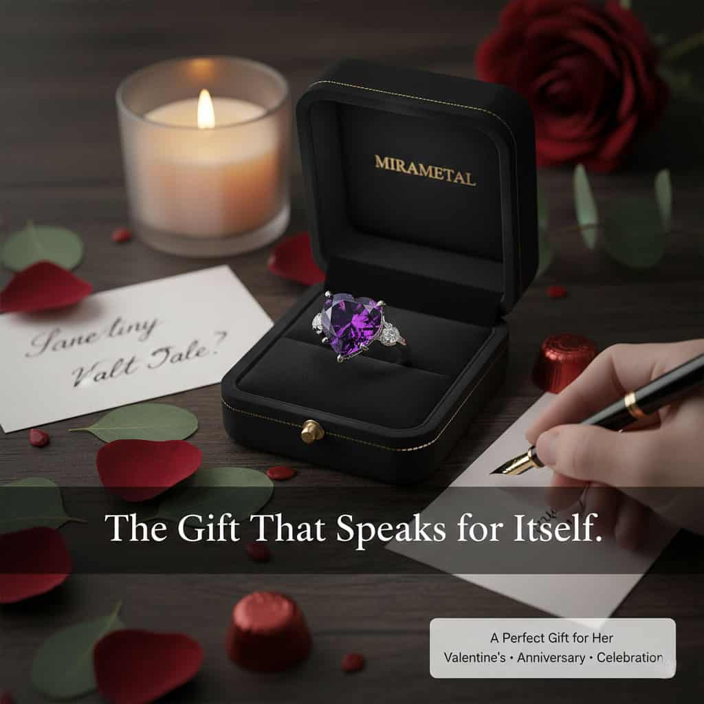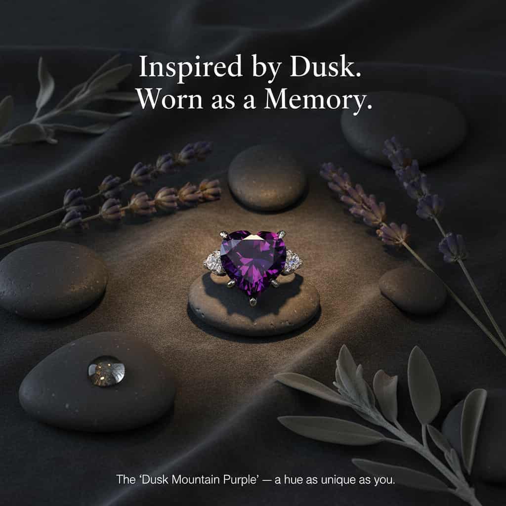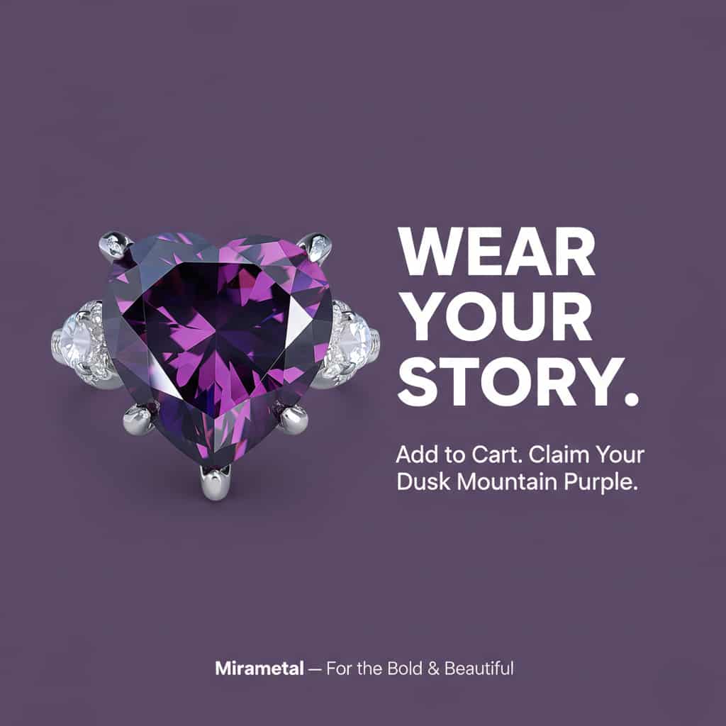 Elevate your style with the MIRAMETAL “Twilight Mountains Purple” heart-shaped ring. This striking ring is crafted from high-quality S925 sterling silver and features a captivating 12×12 mm high-carbon diamond in a rare, deep purple hue.