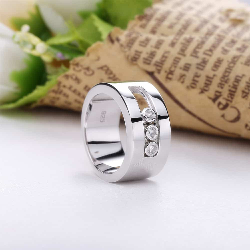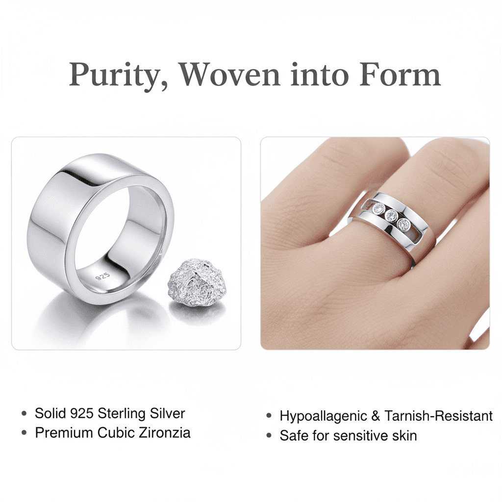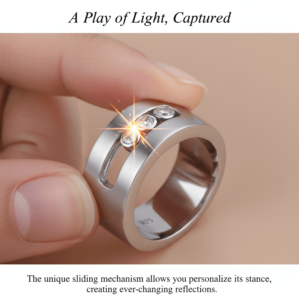Structure and dynamism converge here. Crafted from 925 sterling silver, the Eternal Ring features a signature dynamic double-diamond sliding clasp set within a bold, geometrically openwork band. This ring embodies modern individuality, designed for those who define their own rhythm.
