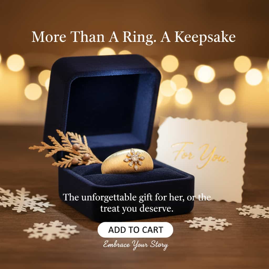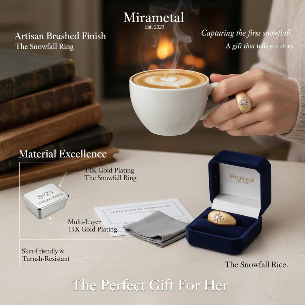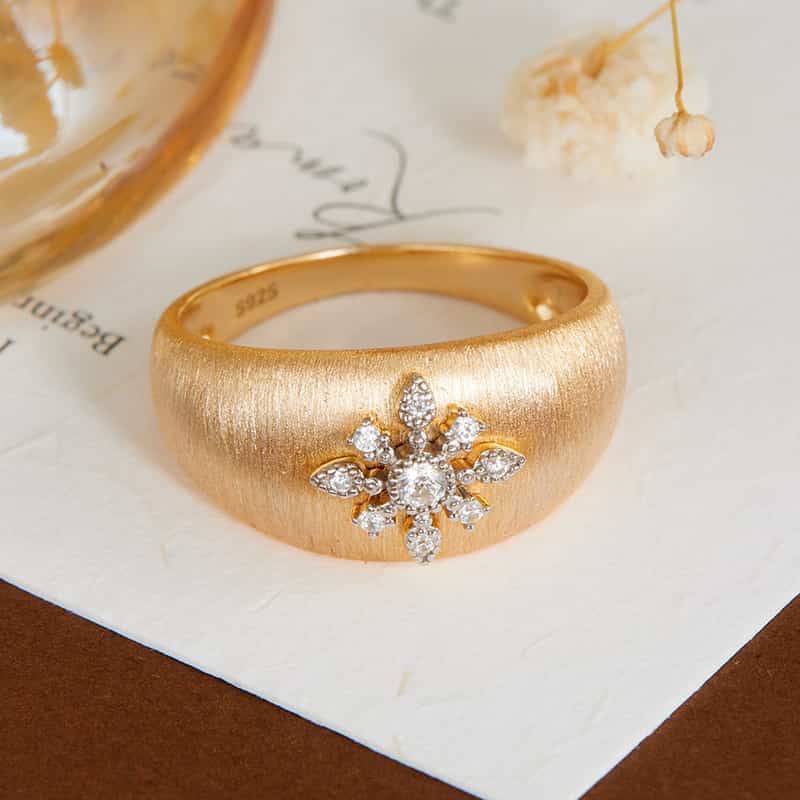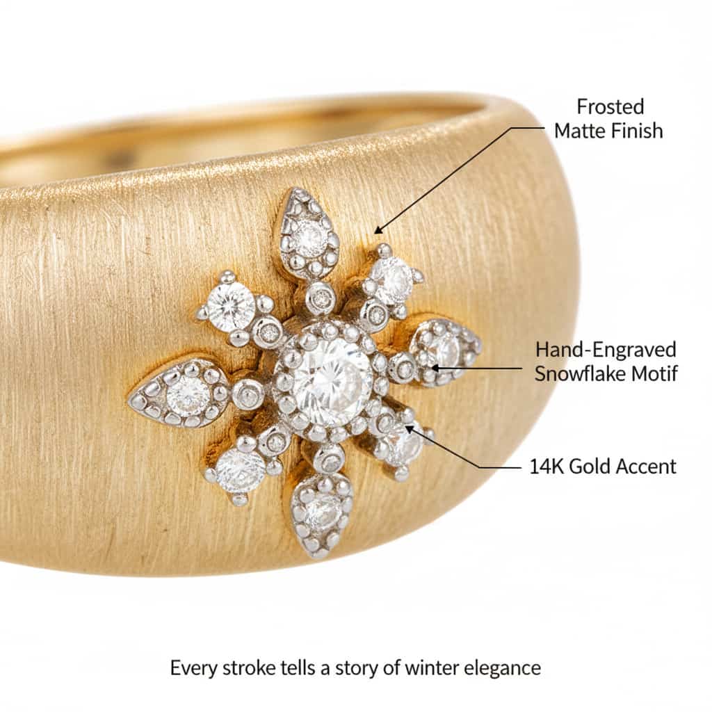 Embrace the timeless charm of winter with our “Snowflake Elegance” statement ring. Crafted from hypoallergenic 925 sterling silver and plated with luxurious 14K gold, this 9.5mm wide band features a unique frosted snowflake pattern and exquisite brushed finish. Whether as a vintage-inspired treat for yourself or a meaningful gift for her, this durable and tarnish-resistant ring will add a touch of refined natural beauty to your jewelry collection.