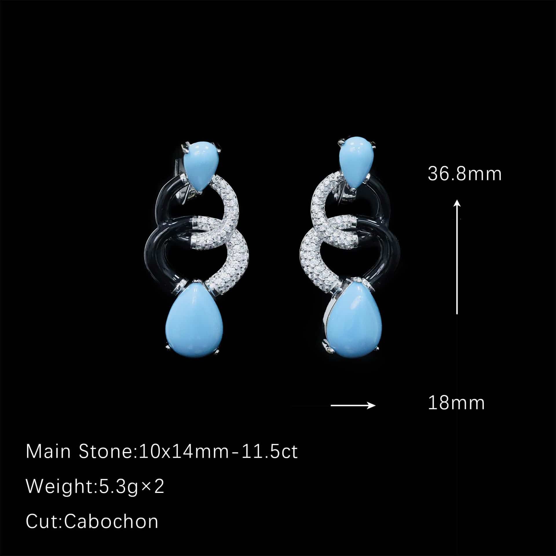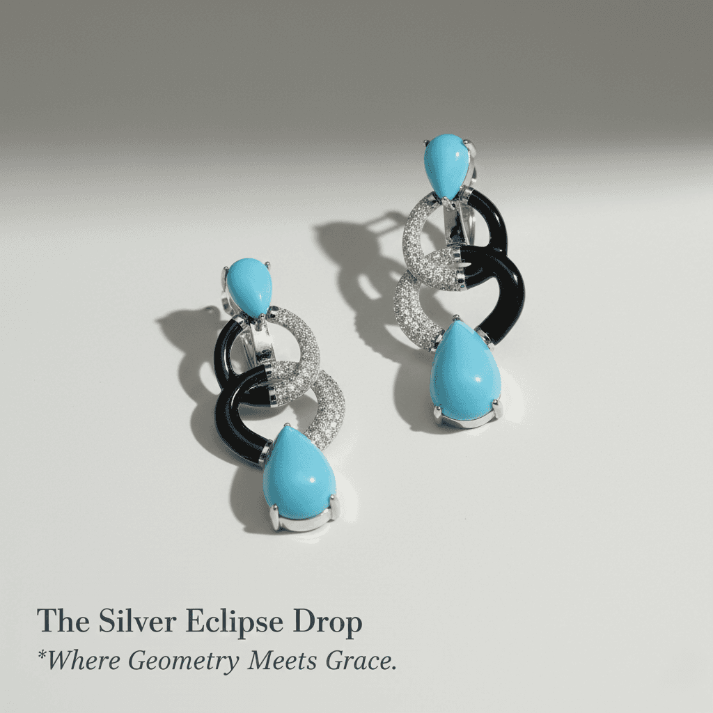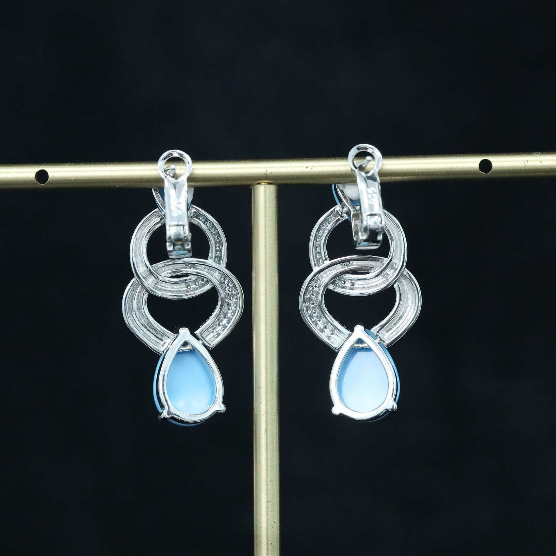 Silver Eclipse Geometric Teardrop Earrings – 11.5 carat natural blue-green turquoise and diamonds in 925 sterling silver, unique women’s jewelry.