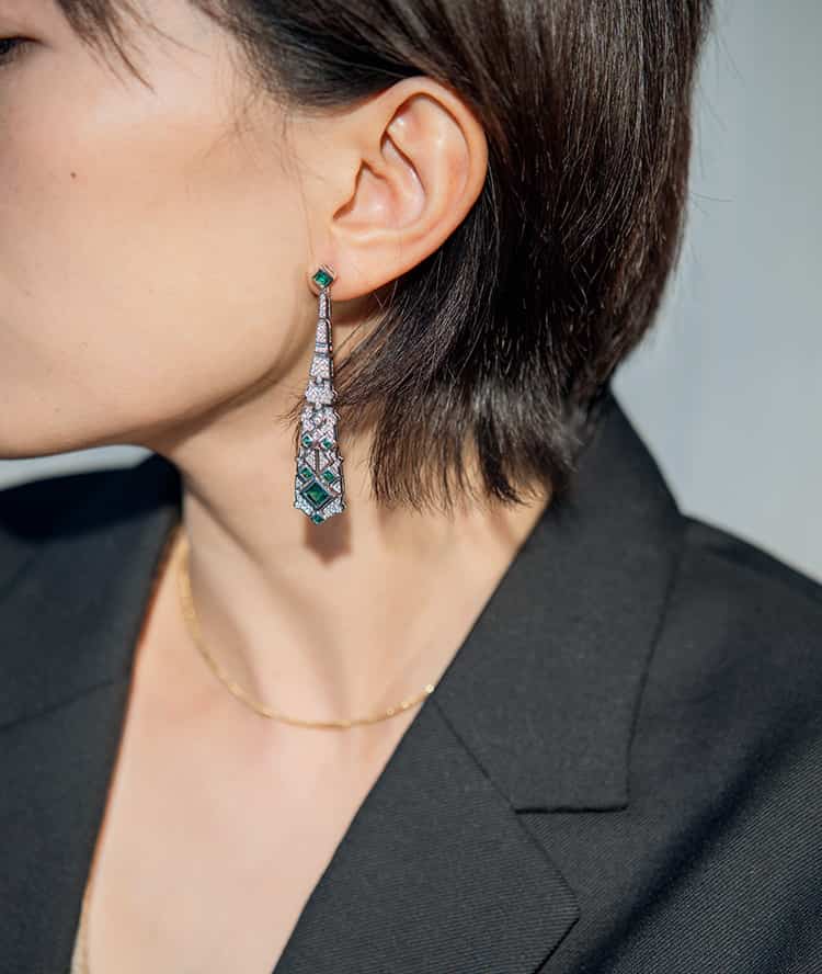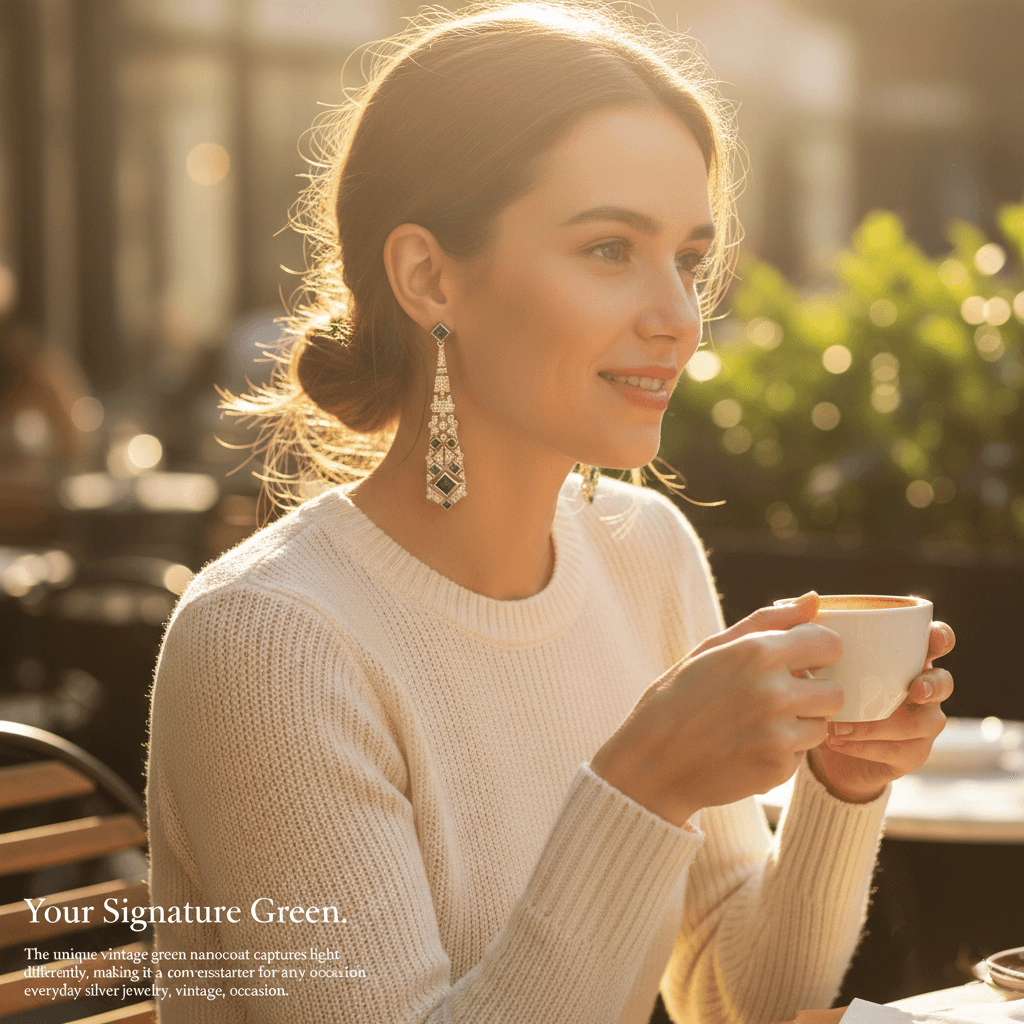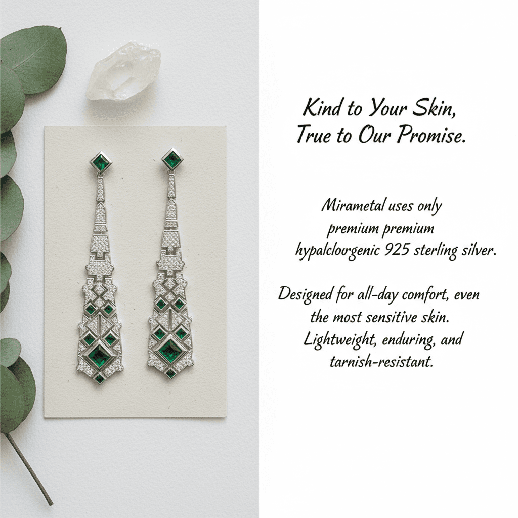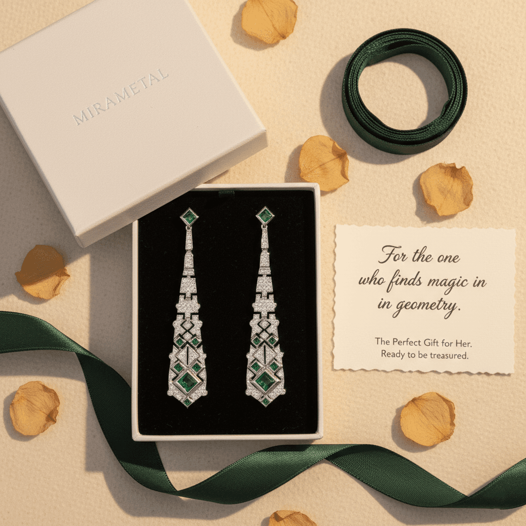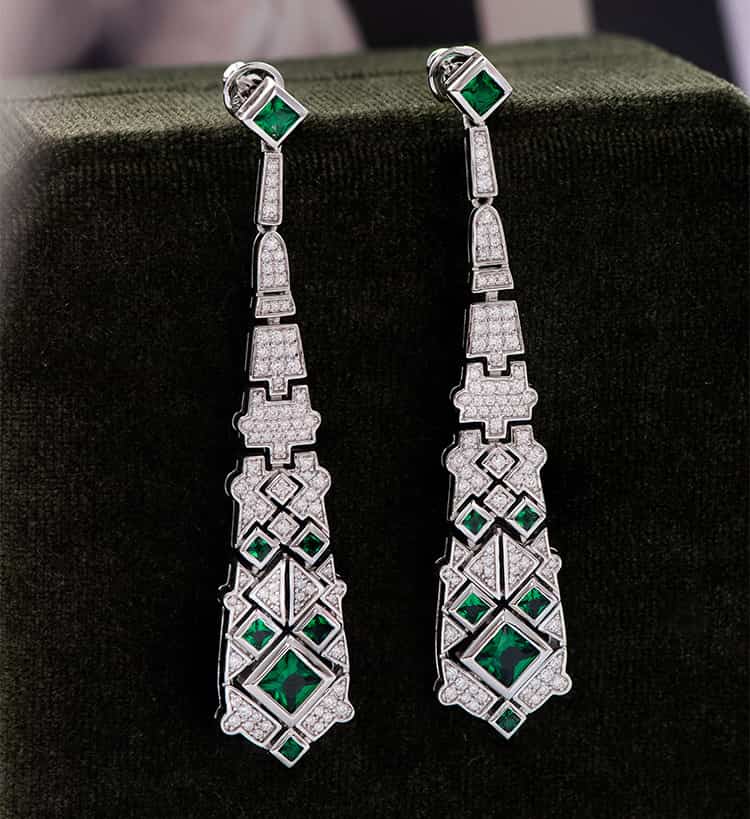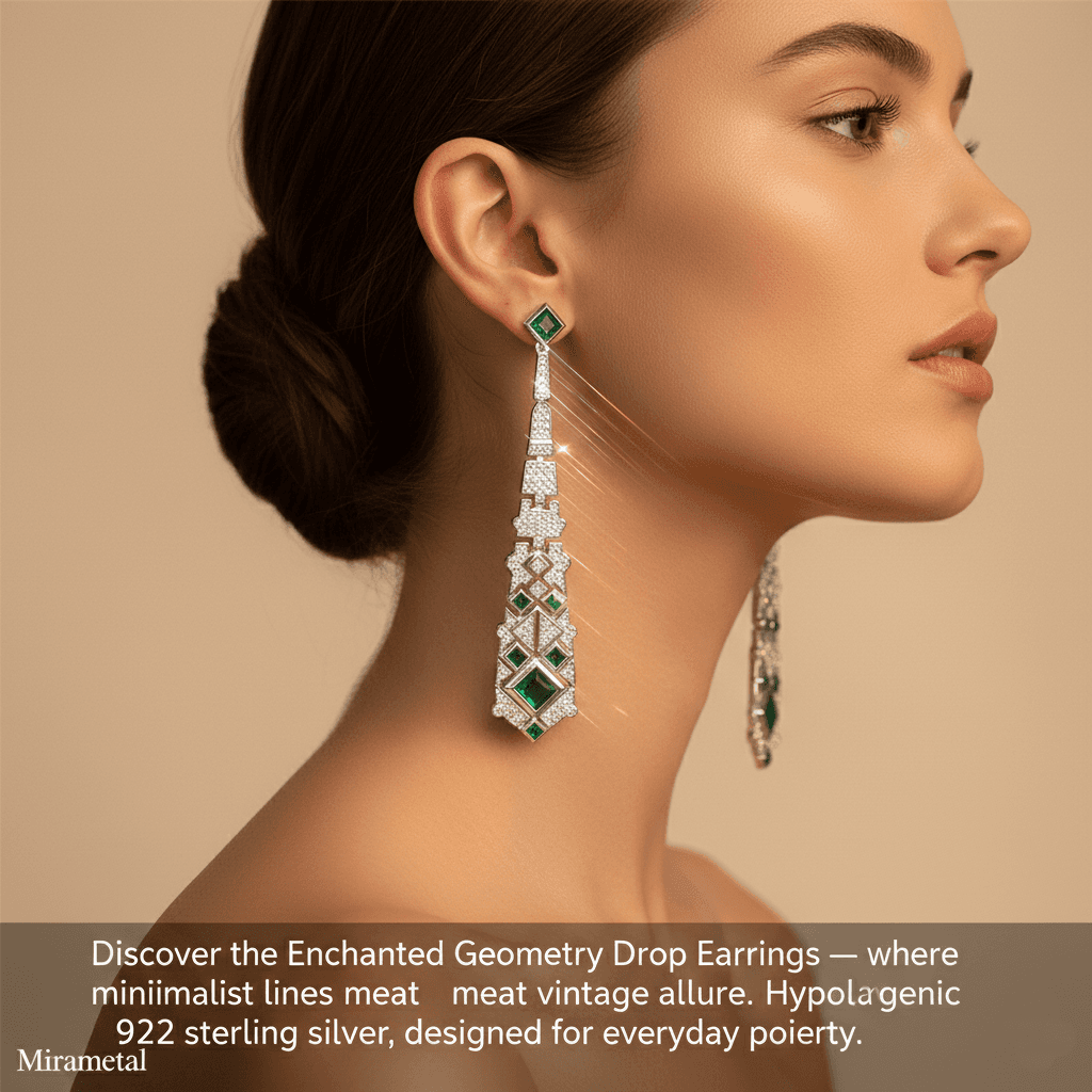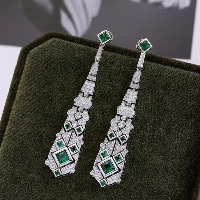 Exude refined elegance with these captivating geometric pendant earrings. These 60mm earrings blend modern minimalist lines with vintage charm, designed to elongate your silhouette and capture light and shadow with every movement. Featuring a unique deep green nano-coating and sparkling 5A-grade zircon, the earrings perfectly balance artistic flair with classic elegance.